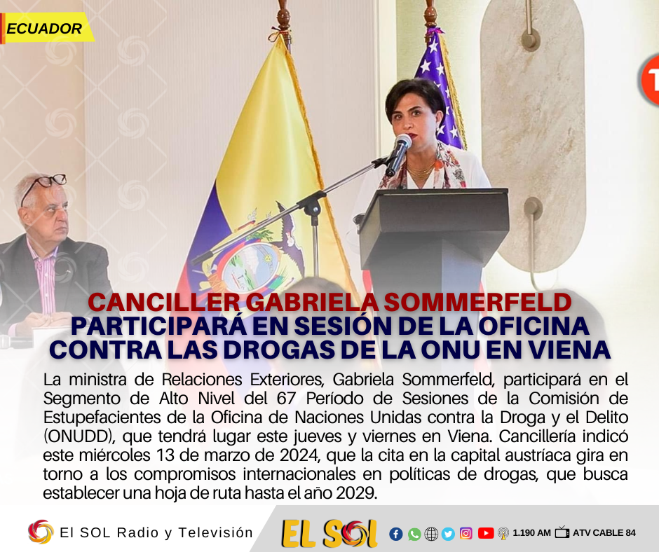 La ministra de Relaciones Exteriores, Gabriela Sommerfeld, participará en el Segmento de Alto Nivel del 67 Período de Sesiones de la Comisión de Estupefacientes de la Oficina de Naciones Unidas contra la Droga y el Delito (ONUDD), que tendrá lugar este jueves y viernes en Viena.