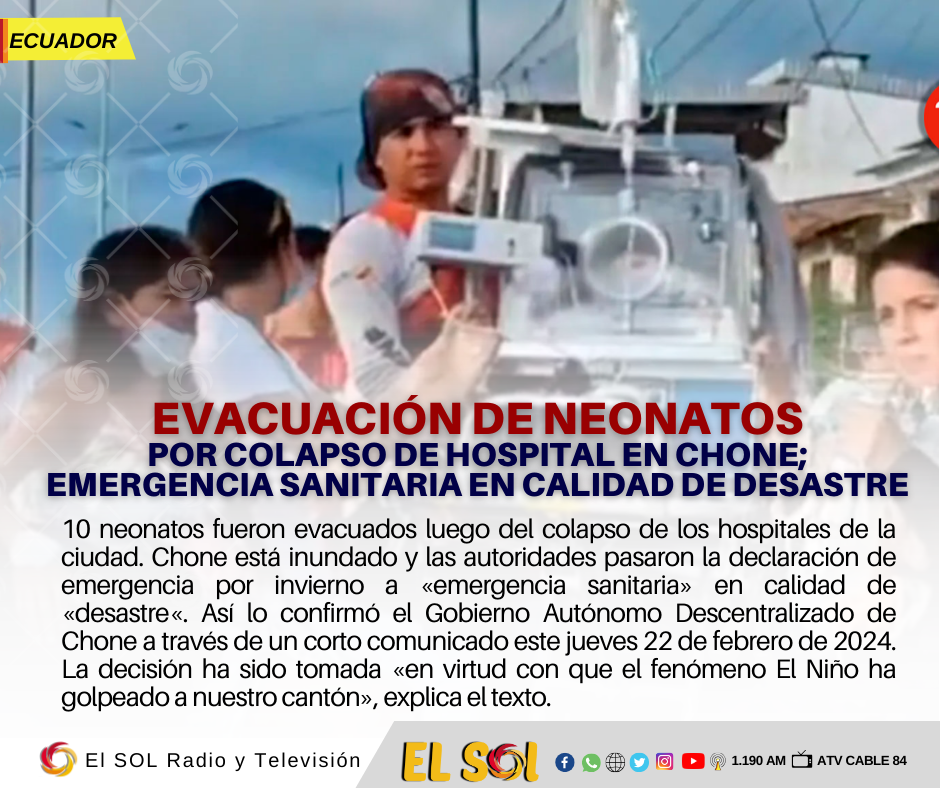 10 neonatos fueron evacuados luego del colapso de los hospitales de la ciudad. Chone está inundado y las autoridades pasaron la declaración de emergencia por invierno a «emergencia sanitaria» en calidad de «desastre«.
